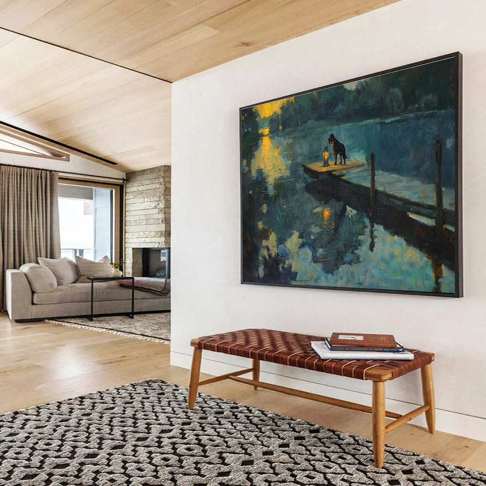 A dog stands by a lantern on a river dock at sunset. The warm glow of the setting sun reflects on the water, creating a serene and nostalgic scene. Inspired by quiet evenings by the water, the artist uses realistic brushstrokes to capture the mood, similar to Andrew Wyeth’s contemplative style. Ideal for a cozy cabin living room or a lakeside home office. Bring the tranquility of nature indoors – a piece that warms the heart.
