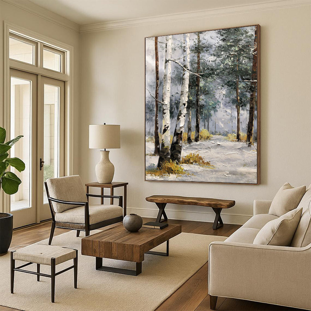 Wander down a "Frosty Forest Path" of soft grays and muted golds. Inspired by the quiet realism of Caspar David Friedrich, the artist studied winter’s light to paint the snow’s glow and trees’ stark beauty, layering paint slowly to build depth. Ideal for a study, fostering focus, or a guest bedroom, evoking cozy winter nights. This painting is a quiet retreat – let it bring the peace of a winter walk to your home.