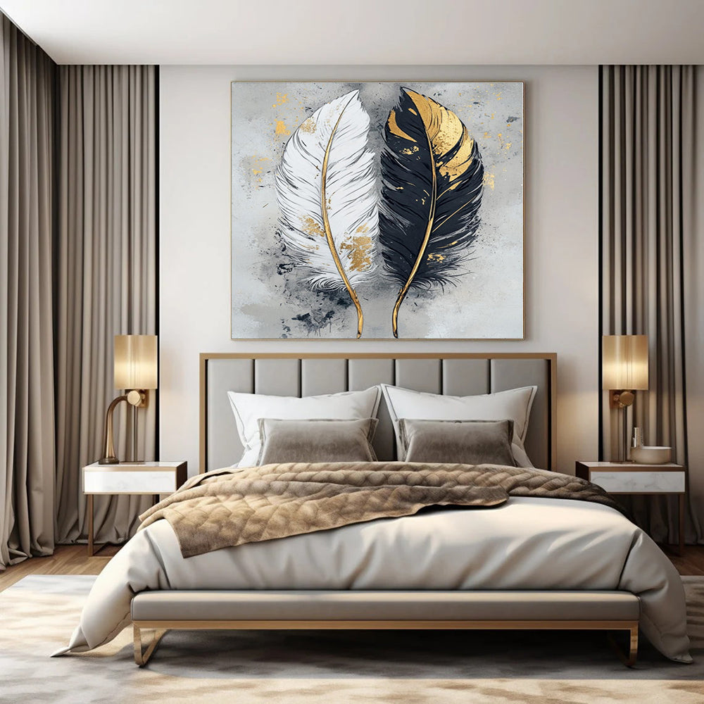 Detailed white and black feathers with gold accents pop against a muted, artistic background. Blends realism and abstraction, inspired by contemporary nature art. Great for entryway benches (adds whimsical, welcoming charm) or bedroom headboards (infuses personal, bohemian - luxe style). Let these gilded feathers bring a touch of nature’s elegance indoors—transform your space into a feather - light sanctuary. Type: Hand Painted Contemporary Abstract Paintings, Packing: Rolled and shipped in a solid tube. The painting come with EXTRA 2-3 inch white border around for stretching or framing.Delivery time: You will receive the painting around 7-12 days( 3-5 days to finish the painting, 5-7 days to your home.by UPS And Dhl)