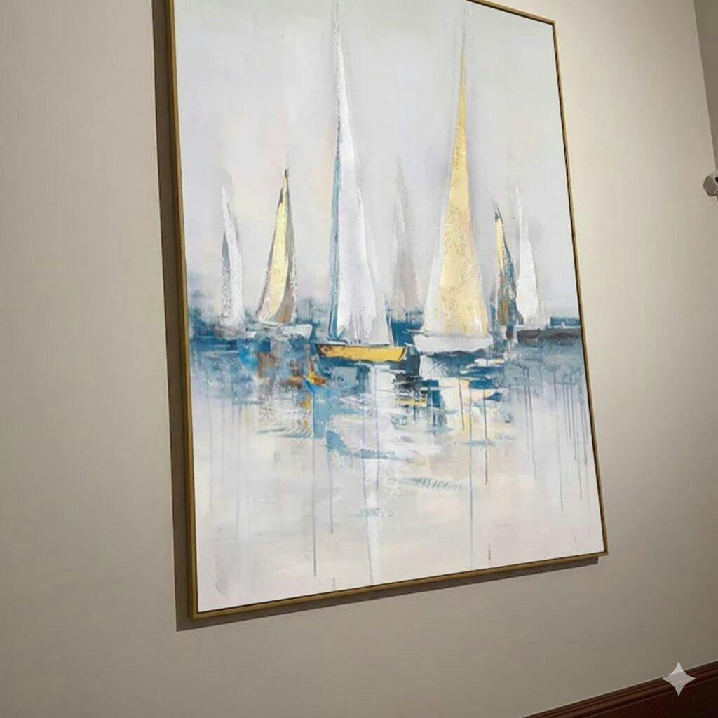 “Sailing in Style” - White, Gold & Blue Nautical Painting On Canvas DLZ257