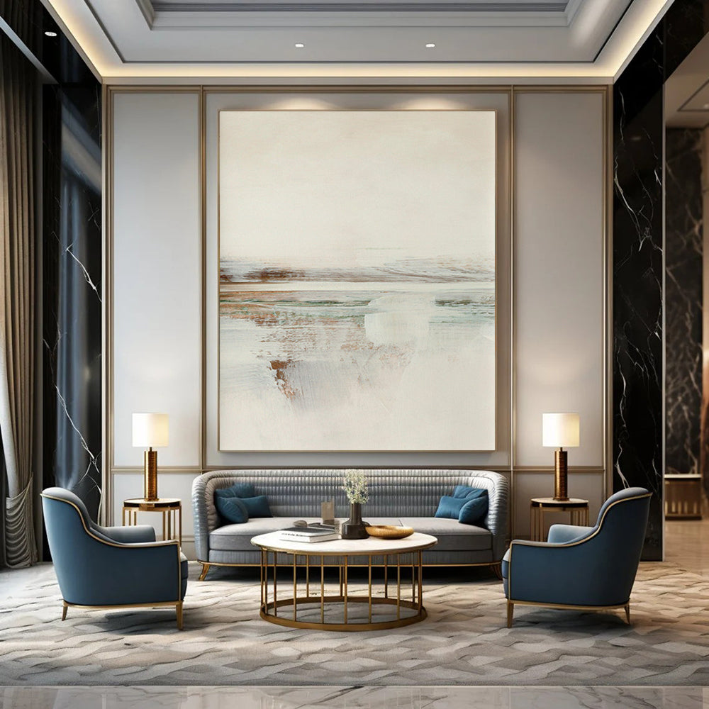 Echoing the soft, muted style of Agnes Martin, this piece captures a coastal view with gentle beige, blue, and green tones. The artist, inspired by the simplicity of a morning at the coast, carefully applied each stroke to create a sense of calm. Ideal for a serene bathroom or a minimalist study. Bring home this painting and let the coastal tranquility soothe your soul. Type: Hand Painted Paintings, Packing: Rolled and shipped in a solid tube. The painting come with EXTRA 2-3 inch white border around for stretching or framing.Delivery time: You will receive the painting around 7-12 days( 3-5 days to finish the painting, 5-7 days to your home.by UPS And Dhl)