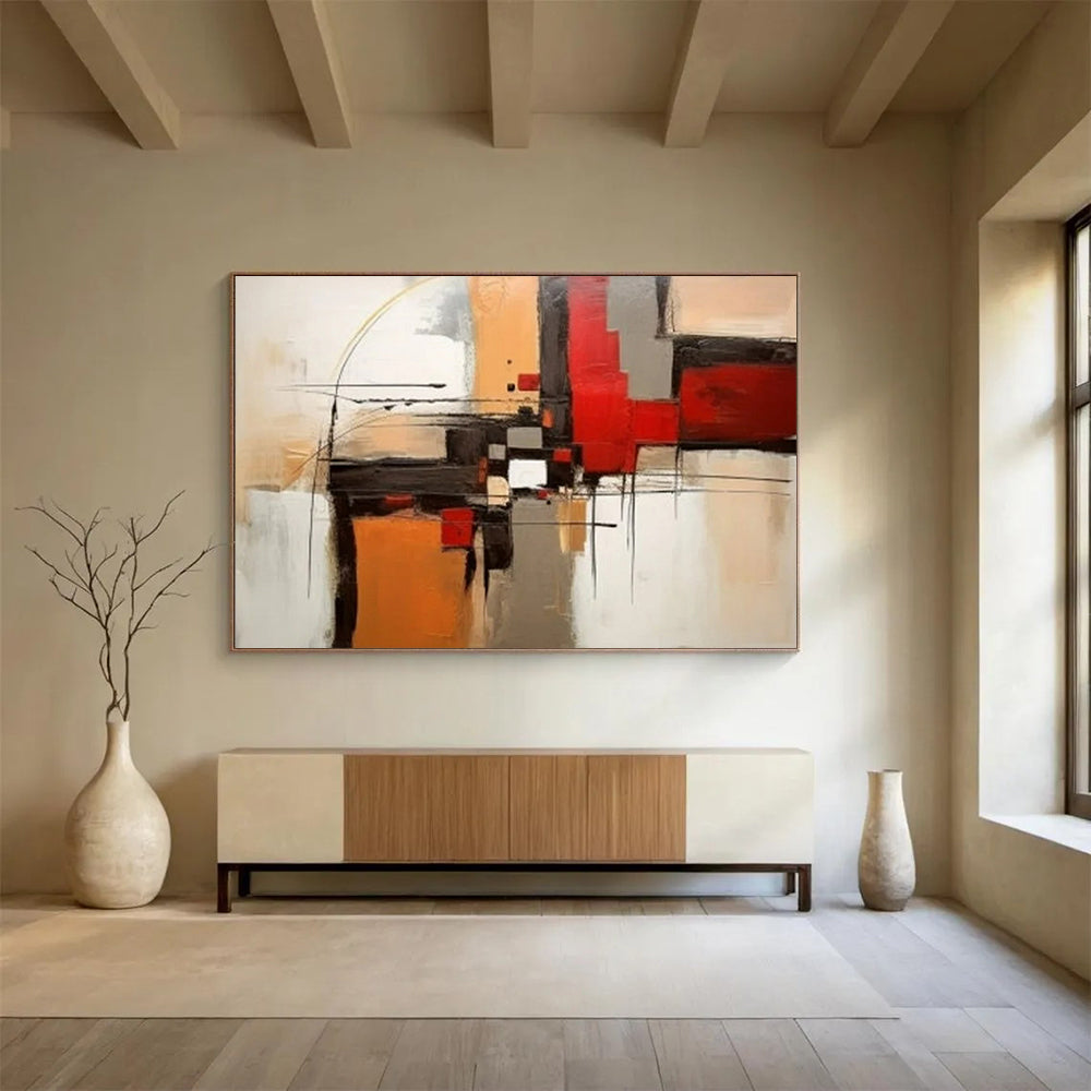 “Structured Chaos” - Reds, blacks, beiges; intersecting geometric lines and blocks CT1508