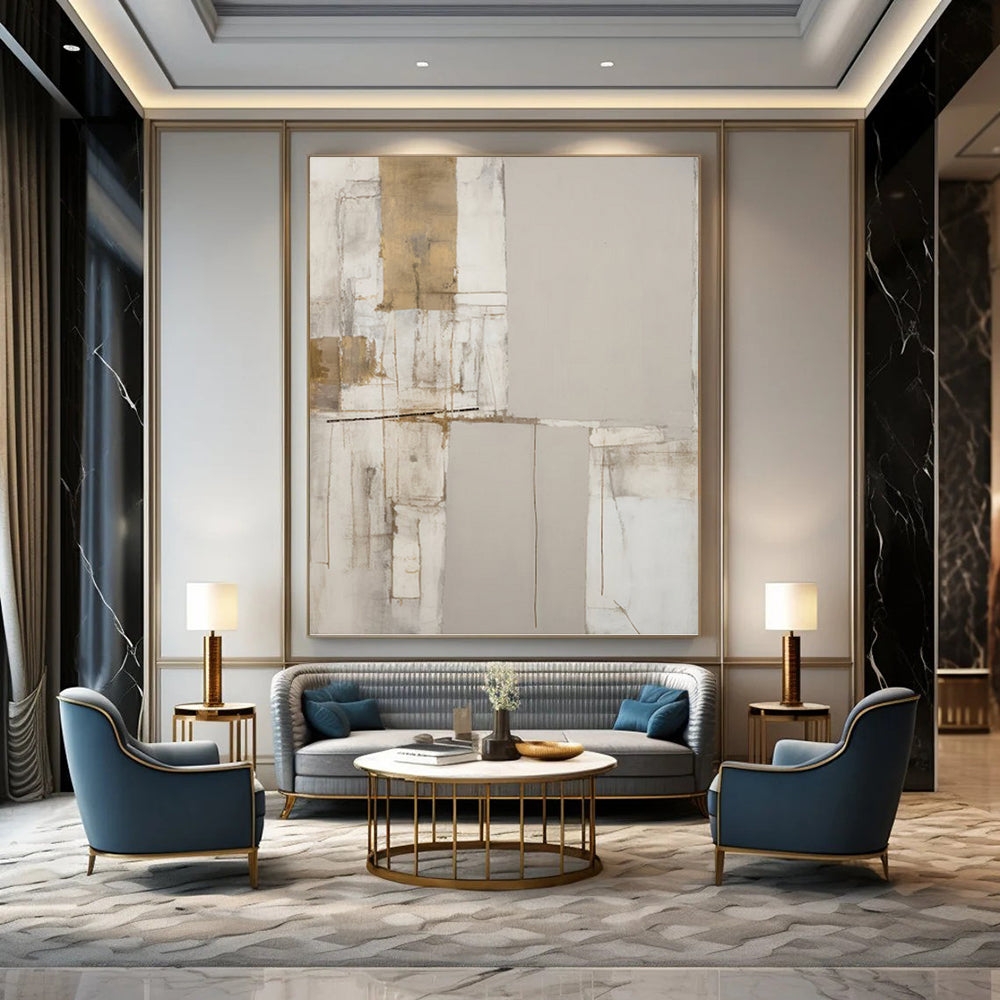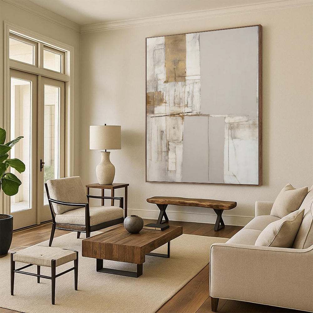 Experience the allure of soft grays, whites, and delicate gold lines. Inspired by the quiet sophistication of Ben Nicholson, this piece plays with the interplay of shapes and subtle color variations. The artist carefully crafted each element to achieve a balance between simplicity and complexity. It’s a perfect fit for a meditation room, where its serene tones can help create a peaceful and focused environment, or a modern dining room, adding a touch of refined grace to your meals. This artwork is a testament to the power of subtlety, inviting you to pause and appreciate the beauty in the details. Make it yours and let your space become a haven of calm elegance.