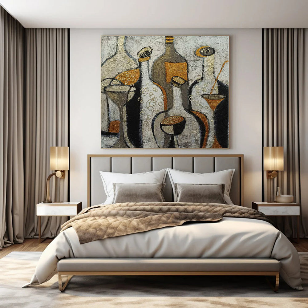 Stylized bottles and glasses with textured surfaces in neutral and gold tones, reminiscent of cubist art. Inspired by the still lifes of Pablo Picasso, it plays with shape and texture. Great for a dining room (adding a touch of artistic elegance) or a kitchen (creating a sophisticated, culinary - inspired vibe). Let the textures tell a story. A unique, artistic addition.