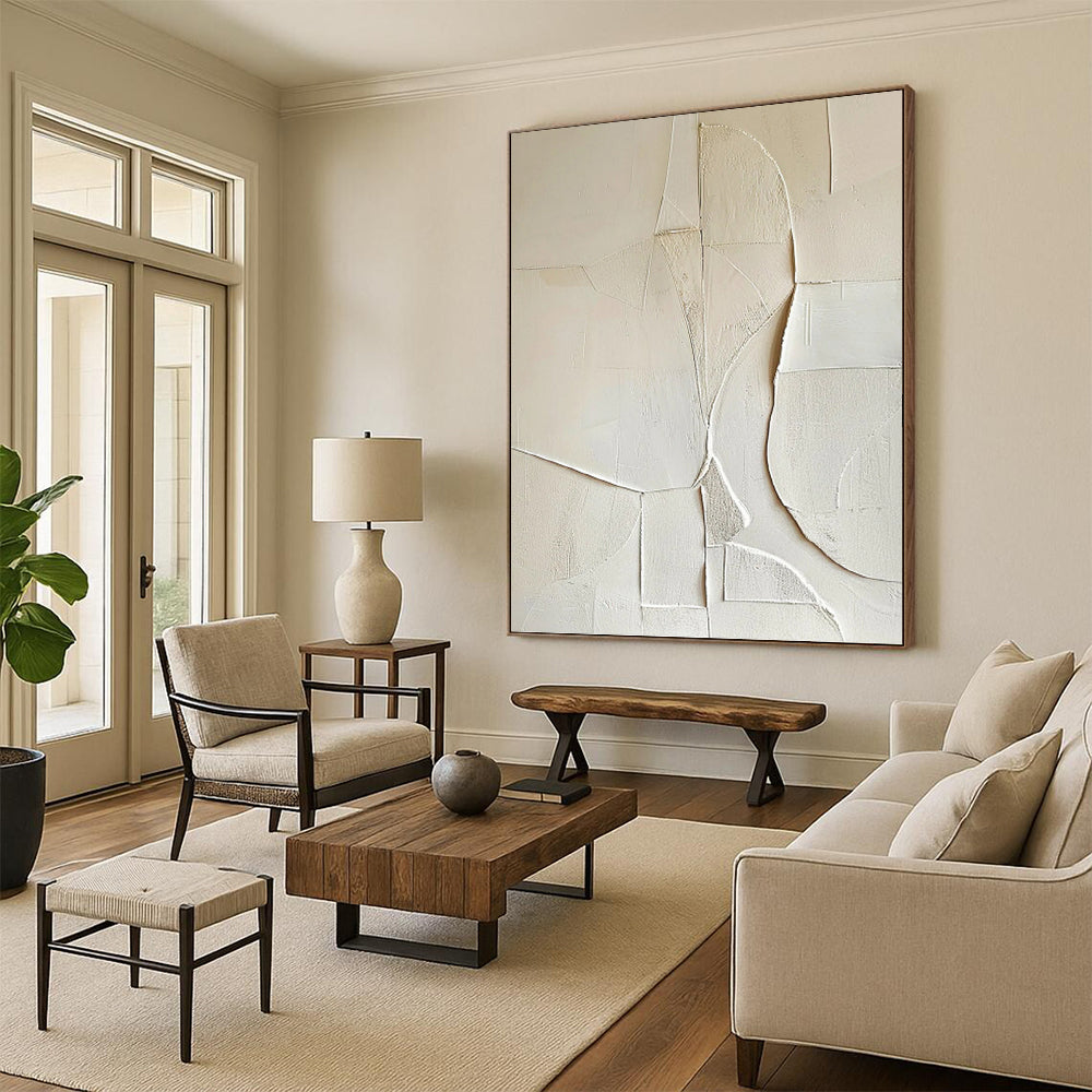 Dive into the world of texture with "White Textured Abstract Composition". Varied white textures and shapes create a visually intriguing and serene piece. Influenced by the textural explorations of Robert Ryman, the artist used different techniques to build up the white layers, creating a sense of depth and complexity. Each texture is unique, inviting you to explore the painting up close. This work is ideal for a minimalist bathroom, adding a touch of artistic sophistication, or a modern bedroom, creating a peaceful and inviting atmosphere. For those who love the beauty of white and texture, this painting is a gem. Bring home this white textured beauty and let your walls shine with artistic depth.